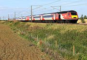 43313 speeds past Yaxley on 6 September 2012 with the 1E03 06:25 Edinburgh to Kings Cross East Coast service. The complete train is in the interim East Coast livery, a modification of National Express's colour scheme. Since effectively being renationalised, the livery has changed again, as shown on 43272, seen a little earlier at the same location. |