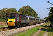 43304 passes Up Hatherley on 3 September 2010 with the 1V50 06:08 Edinburgh to Plymouth CrossCountry service. This location is fine if the sun isn't out, but photography is severely restricted if the sun appears, due to the tall trees on the right. |