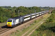 43303 brings up the rear of the 9V59 09:00 Glasgow to Plymouth CrossCountry service at Spetchley on 8 October 2008. The lead power car is 43285. Particularly noteworthy is the use of former Midland Mainline coaches. This was a temporary measure, as whilst the reliveried power cars were ready for the start of the new service a few weeks earlier, the coaches had yet to be repainted. |