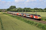 A stranger in the Cotswolds! On hire from Virgin East Coast, 43305 leads the 1S51 12:25 Plymouth to Glasgow Central CrossCountry service past Up Hatherley on 13 August 2017. CrossCountry's own 43207 was on the rear. Just three minutes behind this train was 68016 working the 5Z41 14:02 Pengam Sidings to Burton upon Trent Wetmore Sidings ECS, but unfortunately the 1V06 13:10 Nottingham to Cardiff Central, worked by a pair of Class 170 units got in the way, and prevented me getting a picture! |