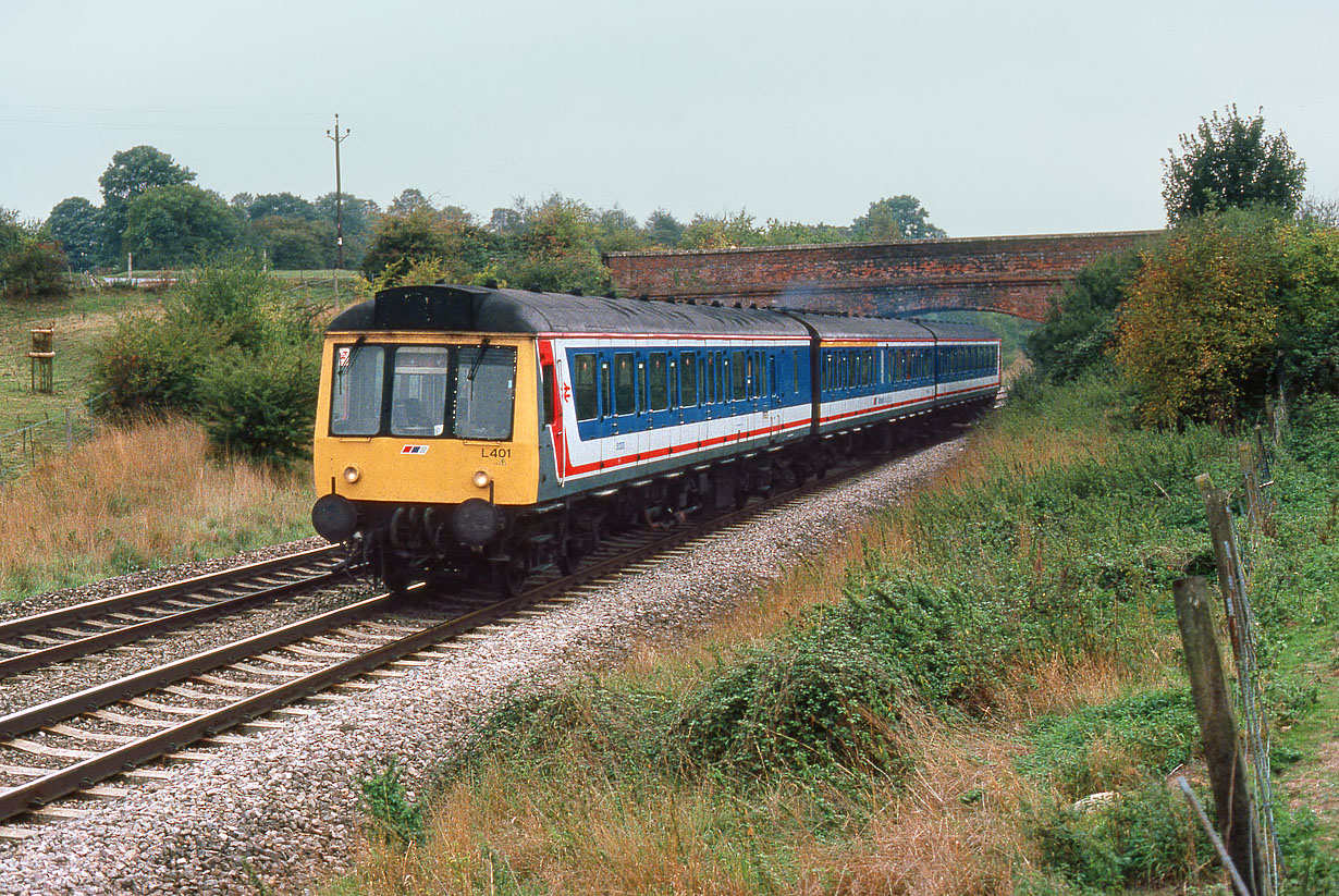 Still accelerating away from Hungerford station, L401 (51333, 59485 & 51375) passes underneath the roadbridge at Hungerford Common on 30 September 1989 with the 2B33 12:59 Bedwyn to Reading Network SouthEast service.