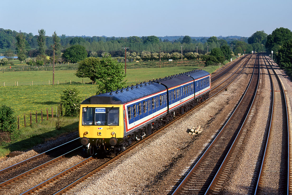 Although nearing the end of its long career working local services along the Thames Valley, L405 (51381, 59491 & 51340) has had a repaint into Network SouthEast livery and positively gleams as it passes Lower Basildon on 17 May 1992 with the 2C66 18:00 Reading to Didcot Parkway service. The set number is positioned further inboard that used to be standard. Within a few months it would be replaced by Class 165 & 166 Turbo units. The lead vehicle has found a new life in preservation at Mangapps Farm Railway Museum, but the other two vehicles were not so lucky, both being cut up in the late 1990s. Strangely, as if to emphasise they had finally fled the Western Region, one was broken up in Scotland, the other in Wales! |