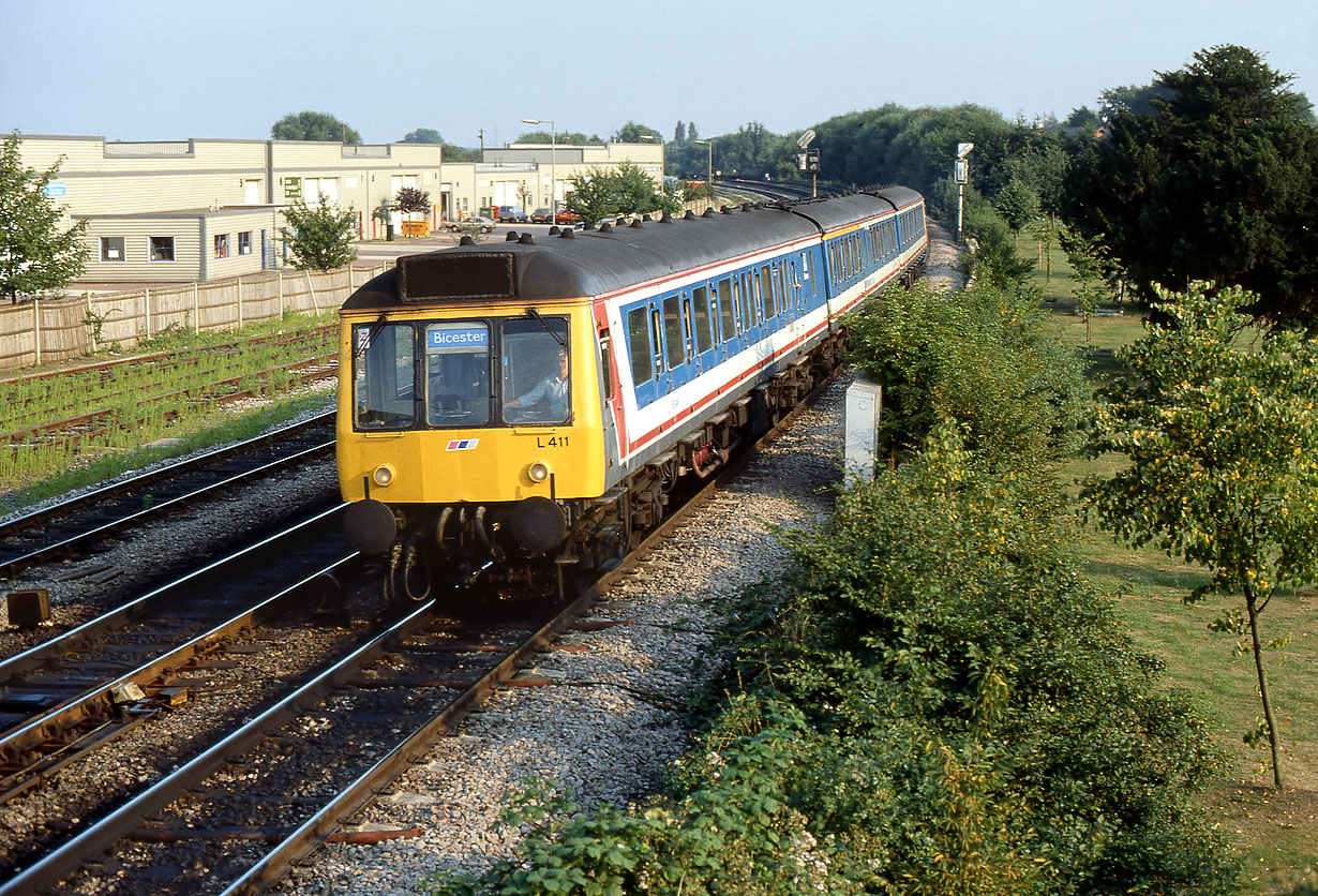 L411 (51346, 59498 & 51388) approaches Oxford on 18 July 1990 with the 2C66 17:35 Reading to Bicester Town Network SouthEast service. The industrial estate in the background occupies the site of the former Great Western Railway goods yard. The large goods shed was demolished in 1983, but a few sidings survived a little longer. |