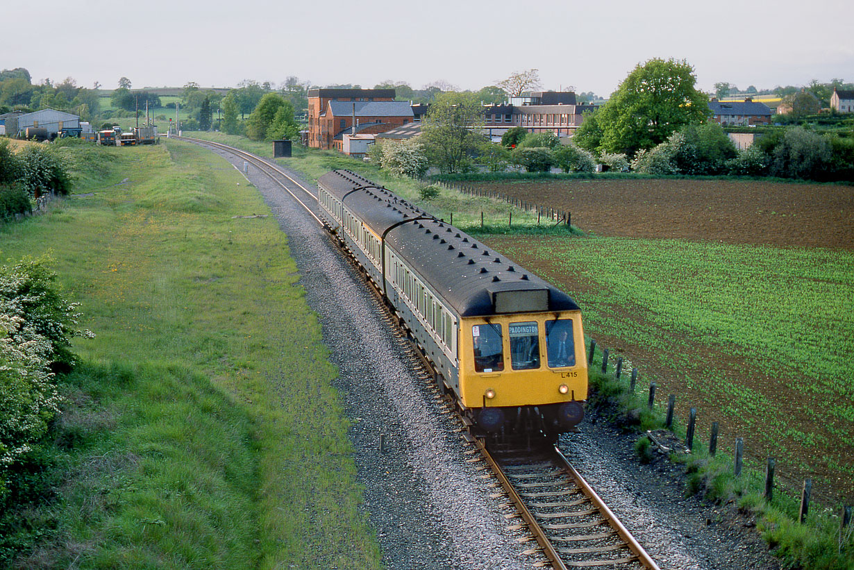 L415 (51351, 59503 & 51393) passes the site of Chipping Campden station on 2 June 1984 with the 2A75 18:45 Hereford to Paddington service. Anyone contemplating the full journey could knock nearly an hour off the trip by changing into a faster train at Oxford, otherwise the journey took 4 hours 34 minutes! The flat grassy area on the left is the site of the formerly rail connected Chipping Campden Gas Works. |