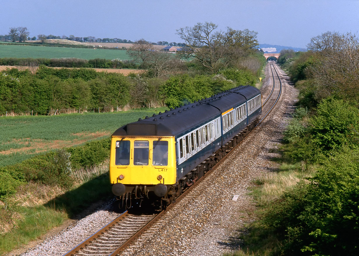 L417 (51354, 59506 & 51396) heads away from the camera at Cassington on 16 May 1986 with the 2A50 15:44 Great Malvern to Didcot Parkway service. The bridge in the background was formerly a farm occupation bridge, but now serves a sewage works. Near the bridge the track suddenly swerves to the right. When the Cotswold Line was singled in 1971, the position of the new single line altered at various places on the route. |