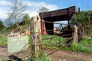 Keadby Bridge (also known as the King George V Bridge) carries the Scunthorpe to Doncaster railway, and the A18 road, over the River Trent at Althorpe. The rolling lift bridge was built between 1912 and 1916, replacing an earlier swing bridge. This view, taken on 26 July 1986, shows the railway side of the bridge, with the lifting section on the right. The bridge was last raised in 1956, and was modified and fixed into position a few years later. |