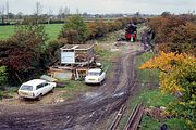 Littleton Colliery was served by a short branch line that diverged from the West Coast Mainline just to the south of Penkridge station. Unfortunately I never did manage to photograph a train on the line, but on 2 November 1985, I took this picture of a rake of HAA MGR wagons at Otherton Sidings, at the point, approximately a third of the way along the branch, where the line changes direction. I presume the three wagons on their own are cripples, that have been detached from various trains. The M6 motorway can be seen in the background. I particularly like the lighting in this picture, and the composition is certainly helped by the inclusion of the silver birch tree. The colliery closed in 1993, and this track has now been lifted. |