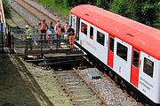 The Cairngorm Mountain Railway, the only funicular railway in Scotland, opened in 2001. It climbs 1,509 feet up the northern slope of Cairn Gorm, and is used extensively during the winters months by skiers. The 2 metre (6 ft 6¾ in) gauge line works on the permanently connected cable system, with one car being hauled to the top, while the other descends. The two cars pass in a short section of double track half way up the incline. Carriage No.2 Cairn approaches Base station, after descending with the 16:10 departure from Ptarmigan station on 30 August 2018. |