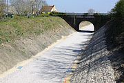 Two new rail projects in one picture at Calvert. In the foreground the newly realigned road from Calvert passes underneath the reconstructed East West Rail line, while in the background a crane marks the site of the HS2 project, crossing the East West Rail line at angle. When the East West Rail line was a single track freight line, the road in the foreground was a few yards to the right of this picture, and crossed the line by an overbridge. 11 May 2024. |