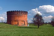 Kilsby Tunnel, on the London & Birmingham Railway, was designed by Robert Stephenson, and opened in 1838. At the time it was the longest railway tunnel in the world. It is notable for the two original ventilation shafts, which feature massive castellated brick towers. The northern shaft, next to the A5, is pictured on 17 March 1989. |
