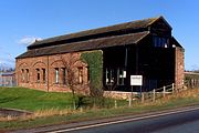Ross-on-Wye lost its railway during the Beeching cuts of the 1960s. The passenger station closed in November 1964, and the goods yard a year later. Although the station building has been demolished, the goods shed and the engine shed survive. The impressive 1855 built engine shed is pictured on 2 March 2003, when there was an unobstructed view of the building from the Ross bypass. Trees now largely hide the former broad gauge structure from view. Note the wagon positioned at the far end of the building. |