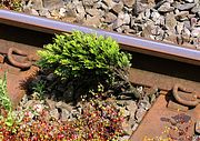 Weeds growing on railway tracks are commonplace on the national network nowadays due to Network Rail's neglect, but this bonsai conifer happily growing in the ballast at Shipton station is a different order of poor maintenance. Sculpted by the passage of westbound trains, this small tree was photographed (with a long lens) from the down platform on 15 June 2016. The old style GWR gangers would be shocked at the state the track is now allowed to get into. |