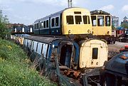 Some Class 120 DMUs had an extended lease of life by being stripped of all seating, and converted into parcels vehicles. One such was DMBC M53714, forming part of set EP (Etches Park) 522. It was withdrawn in April 1987, and is seen here in Vic Berry's scrapyard, Leicester, on 26 September 1987, in the company of 25059, and another unidentified DMU vehicle. |