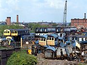 Vic Berry's scrapyard at Leicester, pictured on 31 May 1987. A pile of Class 25 cabs is topped off by the cab of 25284, while on the left Class 101 DTCL 54411 and Class 104 DMBS 54422 are similarly perched high in the air, sitting on other redundant rolling stock. The background is dominated by condemned Mk1 sleeper coaches. |