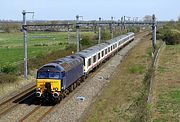 Running 21 minutes early, 67027 passes Minety on 8 November 2025 with the 3S32 10:50 Cheltenham Lansdown Loop to Swindon Transfer Rail Head Treatment Train. This is really just a continuation of the pervious evening's 3S31 21:42 Swindon Transfer to Cheltenham Lansdown Loop working. As usual, 67023 Stella is bringing up the rear. |