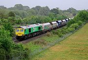 66518 passes Uffington on 8 December 2025 with the 6Z12 08:28 Stoke Gifford to Appleford stone train. I had chosen this location as the lineside trees here retain their leaves well into the winter, adding a bit of colour to the scene. |