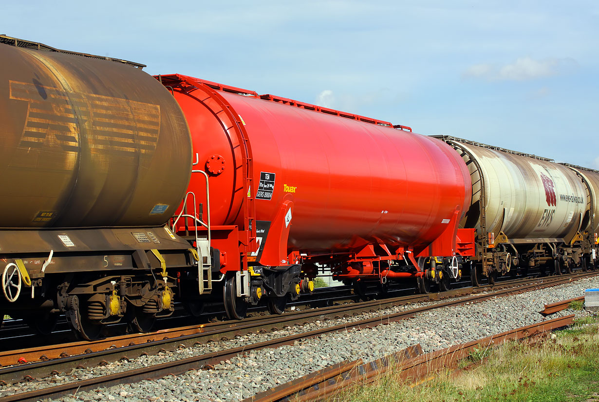 Ex works TEA bogie tank wagon 89004 really stands out compared to its much more typically grubby neighbours, as it forms part of the 6B13 05:02 Robeston to Westerleigh Murco train at Standish Junction on 24 September 2016. The train was being hauled by 60054. Not only is the wagon in a different livery to its neighbours, but also all three wagons in this picture show detail differences of design. |