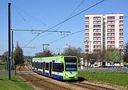 Croydon Tramlink 2547 crosses the large landscaped roundabout at the end of Lodge Lane, New Addington on 1 May 2013, as it heads for the tram terminus with the 13:07 service from Wimbledon. The blocks of flats on the right, and the tram tracks snaking off into the distance, certainly make an eye catching composition. |
