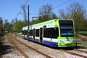 In addition to the typical urban locations, the Croydon Tramlink system has some very rural sections, especially at the southern end of the New Addington line. On 1 May 2013, 2552 rounds the sharp curve near Gravel Hill, at Addington, as it heads for New Addington with the 12:22 from Wimbledon. |