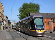 Dublin Luas tram 3016 climbs up the steep Stevens Lane on 23 May 2018 with a service for Tamhlacht (Tallaght). It has just left the stop opposite Dublin Heuston station (at the bottom of the hill), and will shortly be turning right into St. James's Street. The tram system uses the international standard gauge of 4 ft 8½ in, rather than the Irish standard gauge of 5 ft 3 in. |